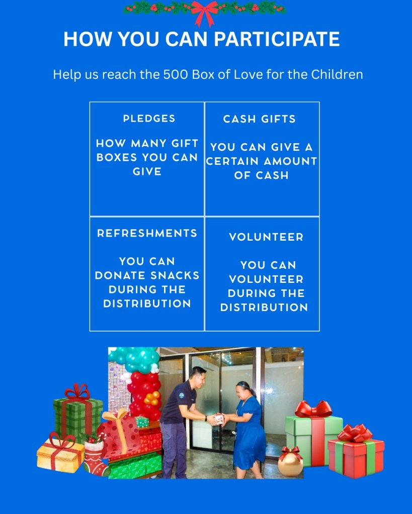 Following the recent devastating earthquake and Typhoon Tino in Cebu, we are expanding our outreach this year to include the impacted children. Our goal is to collect 500 Boxes of Love for all our beneficiaries.